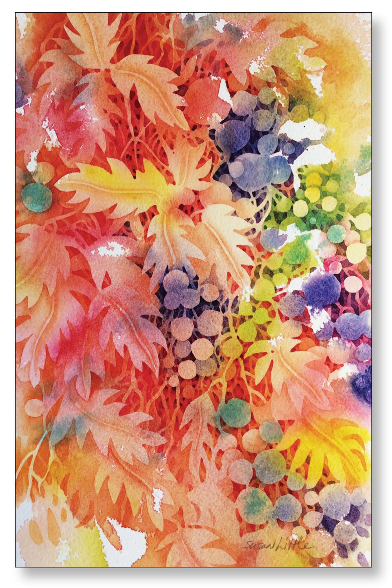 Though I so enjoy painting with acrylic paints my first and true love is working with watercolours. Their bright brilliant colours are spectacular to use right from the tube and when they are mixed together, wow! I like to use a limited palette of colours starting with the primaries; a triad of a red, a blue and a yellow. My absolute favourite triad of colours are permanent rose, cobalt blue and aureolin yellow. These three colours sparkle when mixed together and can give you a myriad of juicy colour options, your greens, oranges, purples. There is an instant harmony in your painting when you work this way.